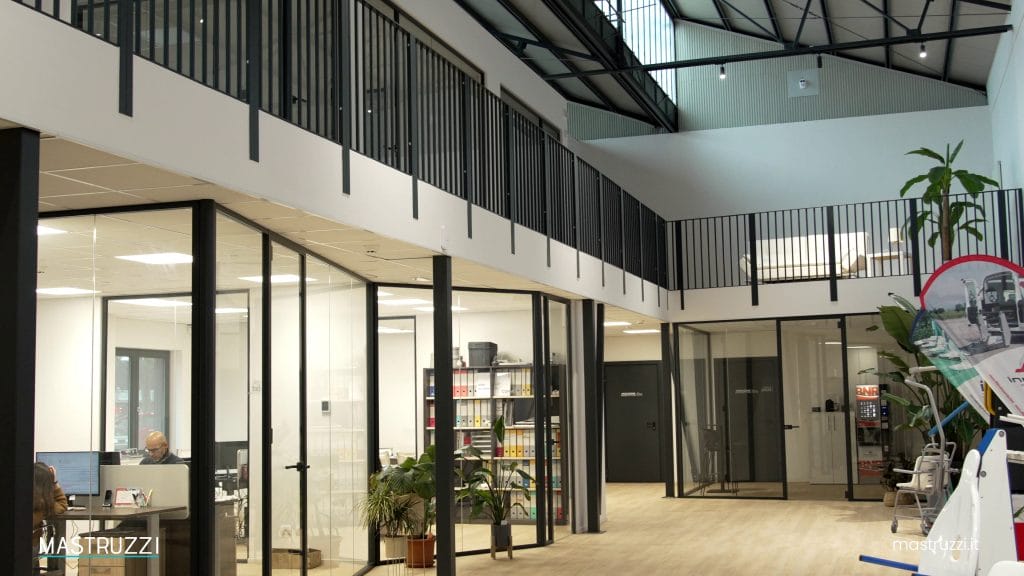 Mastruzzi progetta ambienti di lavoro che uniscono funzionalità e comfort, ottimizzando luce naturale e materiali innovativi come il vetro.